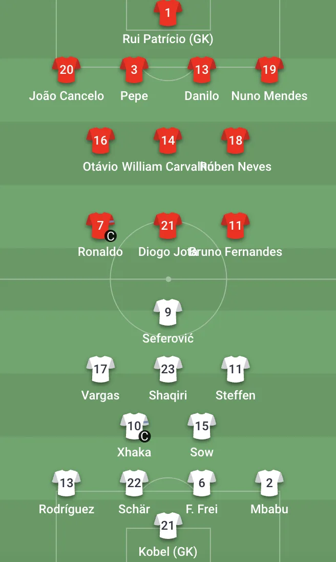 瑞士首发:21-科贝尔、13-罗德里格斯、22-舍尔、6-弗莱、2-姆巴布、10-扎卡、15-索乌、17-瓦格斯、23-沙奇里、11-斯特芬、9-塞费罗维奇