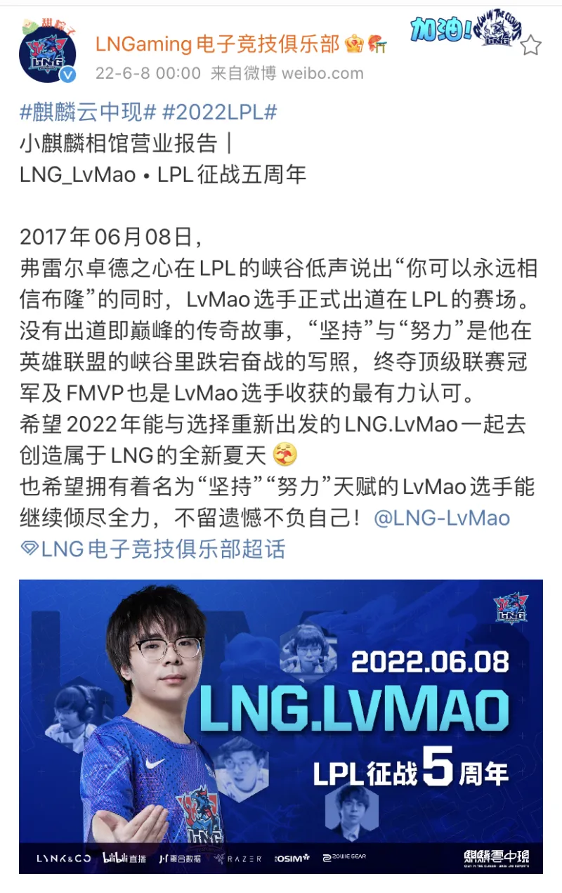 06月08日讯 LNG祝贺LvMao征战LPL五周年,以下是微博原文:
