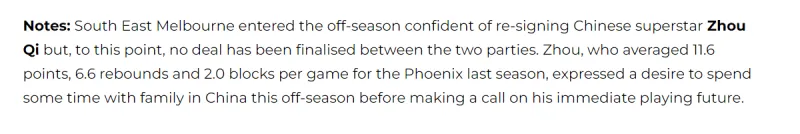 官方写道:“东南墨尔本凤凰在休赛期对于续约周琦很有信心,但直至目前,两边没有完成续约。周琦上赛季场均得到11.6分6.6篮板2盖帽,表达了休赛期想在中国陪伴家人,然后决定下一步。”