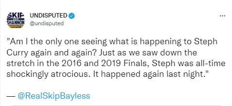 “我是唯一一个一次又一次看到在斯蒂芬-库里身上发生的事情的人吗?就像我们在2016年和2019年总决赛中所看到的那样,库里在防守端令人震惊的表现,在昨晚又发生了。”