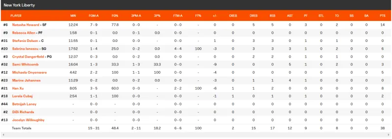 06月11日讯 北京时间今日,WNBA常规赛继续进行,半场纽约自由人38-43印第安纳狂热。