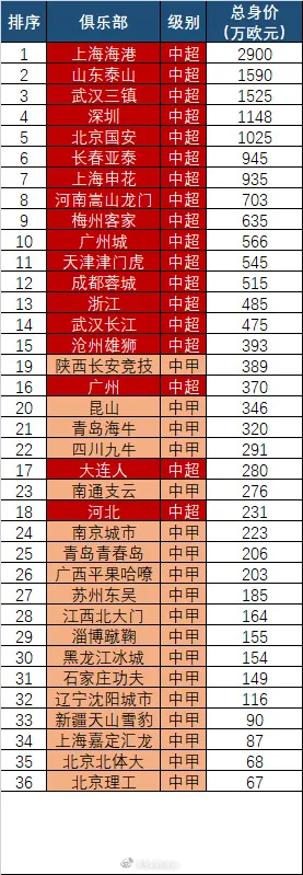 06月11日讯 中超临时转会窗已经关闭,据德国转会市场中国区管理员朱艺统计,上海海港2900万欧占据中超榜首,陕西389万欧领跑中甲。