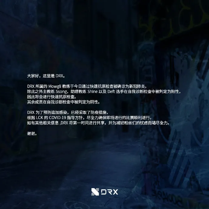 DRX所属的Mowgli教练于今日通过快速抗原检查被确诊为新冠肺炎。