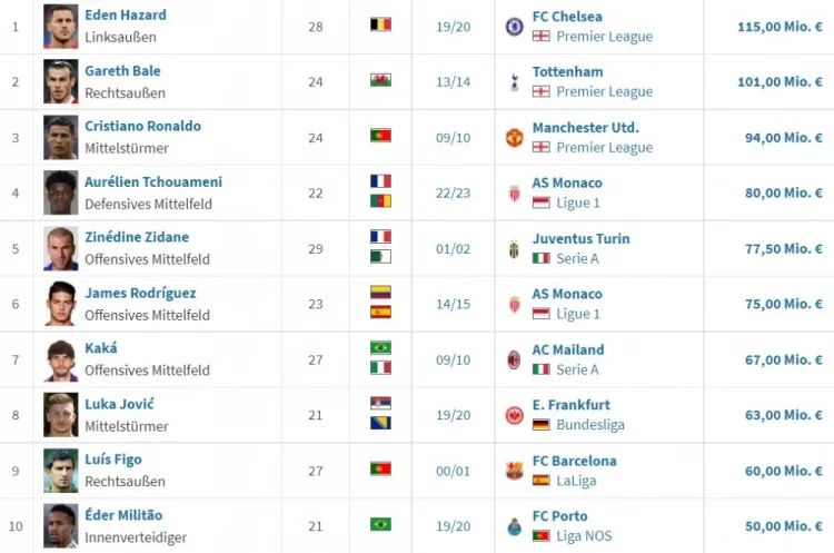 皇马队史引援转会费排行: