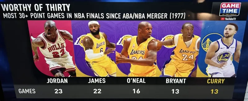 一位记者发了自从联盟合并(1977年)以来的总决赛得分30+场次纪录: