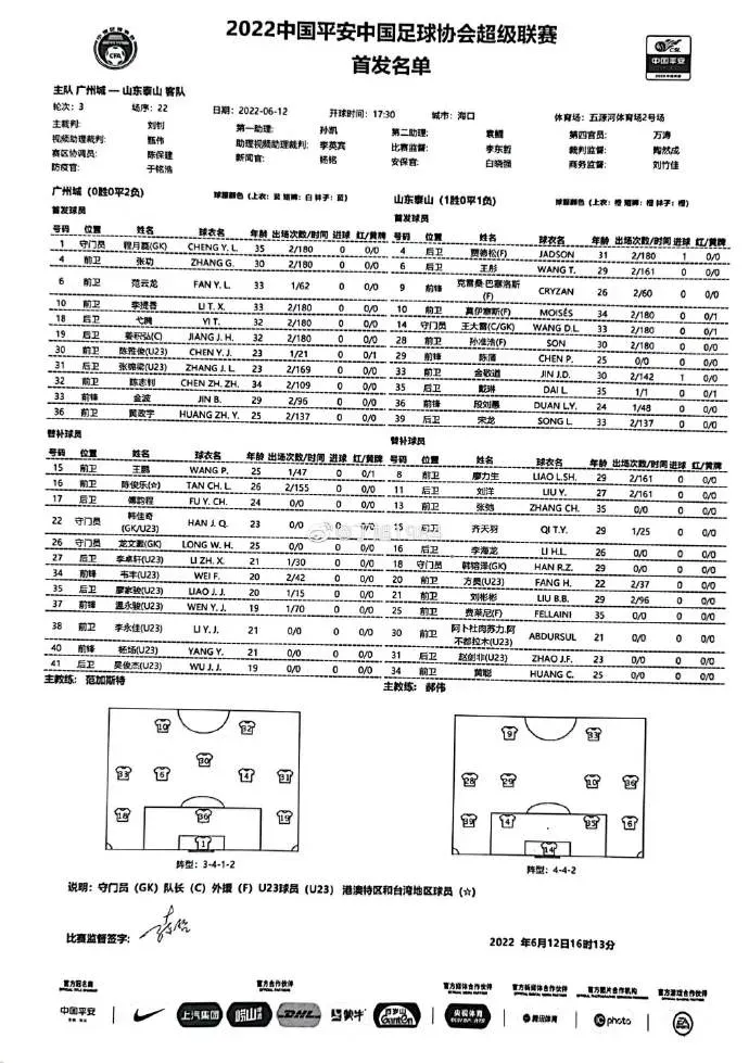06月12日讯 今天下午17:30,中超第三轮,广州城vs山东泰山,赛前双方公布了首发阵容。