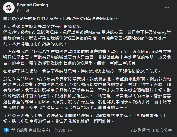 一方面是我自己私心希望在有机会帮助眼前的后辈时尽力帮忙,另一方面Maoan过去存在过瑕疵是事实,而他有足够的游戏实力也是事实,我希望能借由赛训团队的协助,以及他自己的学习,转型为后勤帮助到目前的BYG选手,无论一军或二军成员。