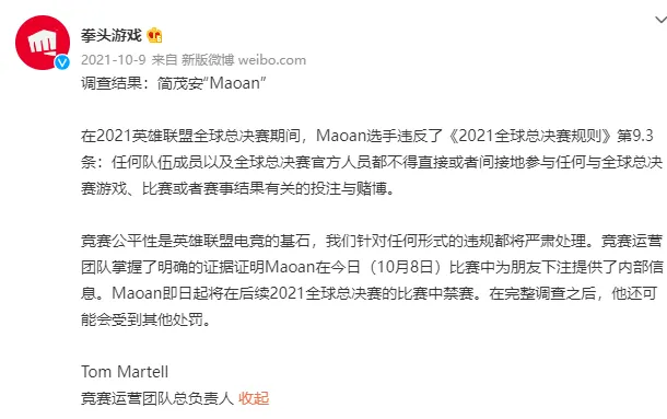 此前Maoan因在世界赛期间涉赌而被拳头官方禁止参加S11剩余的比赛,而此后BYG老板丁特也号称要让Maoan永远离开电竞圈,并向其追究法律责任。