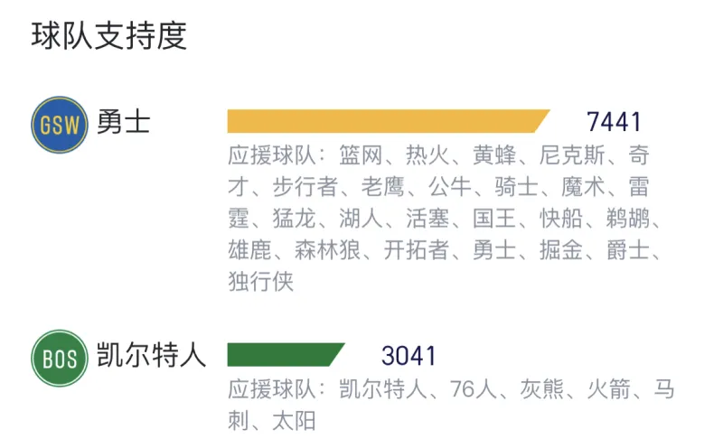 除凯尔特人外,仅有76人、灰熊、火箭、马刺、太阳5支球队仍支持凯尔特人,湖人、篮网等球队均转向支持勇士。