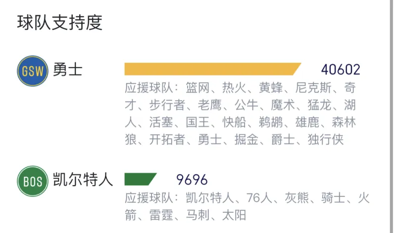 值得一提的是,昨天活动上线时,支持勇士/凯尔特人的球迷群体为24:6,经过一天的投票后,雷霆球迷、骑士球迷由昨日看好勇士赢下G6,变成了看好凯尔特人赢下G6。