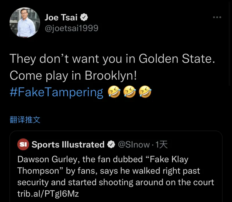 对这件事,篮网老板蔡崇信发推打趣:“他们勇士不想要你,你来篮网打球吧!”