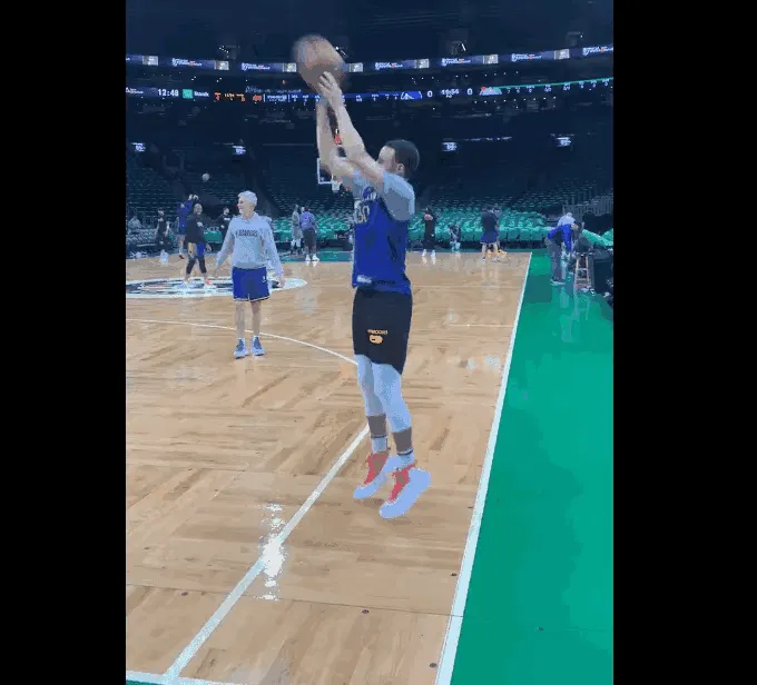 赛前热身时,勇士球员斯蒂芬-库里右手食指缠上黑色绷带。