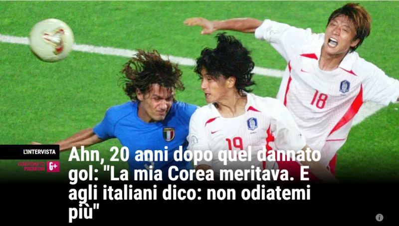 06月18日讯 2002年6月18日韩国队在世界杯1/8决赛淘汰意大利,20年后的今天《米兰体育报》也独家专访了为韩国队攻入制胜金球的安贞焕。