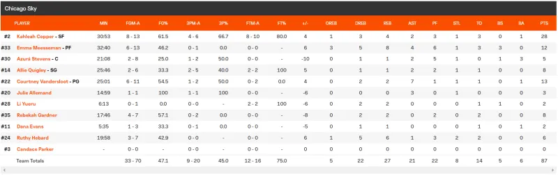 全场比赛,代表芝加哥天空出战的李月汝替补登场6分13秒,投篮1中0,罚球2中2,得到2分2篮板1盖帽。