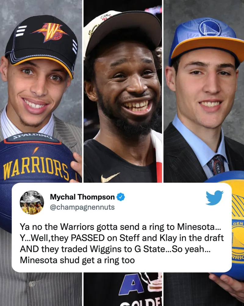 今日克莱-汤普森的父亲迈克尔-汤普森发推:“额,我觉得勇士必须给森林狼送上一枚戒指......他们在选秀中把库里和克莱放给了勇士,后来还把威金斯交易到了勇士......所以是的......我认为森林狼也应该得到一枚戒指。”
