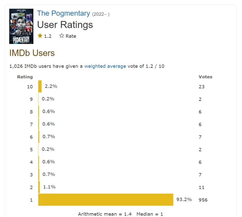 06月22日讯 由亚马逊拍摄的博格巴个人纪录片《The Pogmentary》本月中旬上映。然而在在知名电影数据评分网站IMDb上,这部纪录片的评分仅为1.2分(满分为10分),可谓差评如潮。