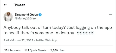 06月23日讯 根据此前报道,德雷蒙德-格林发推表示要在社交媒体上摧毁其他人。