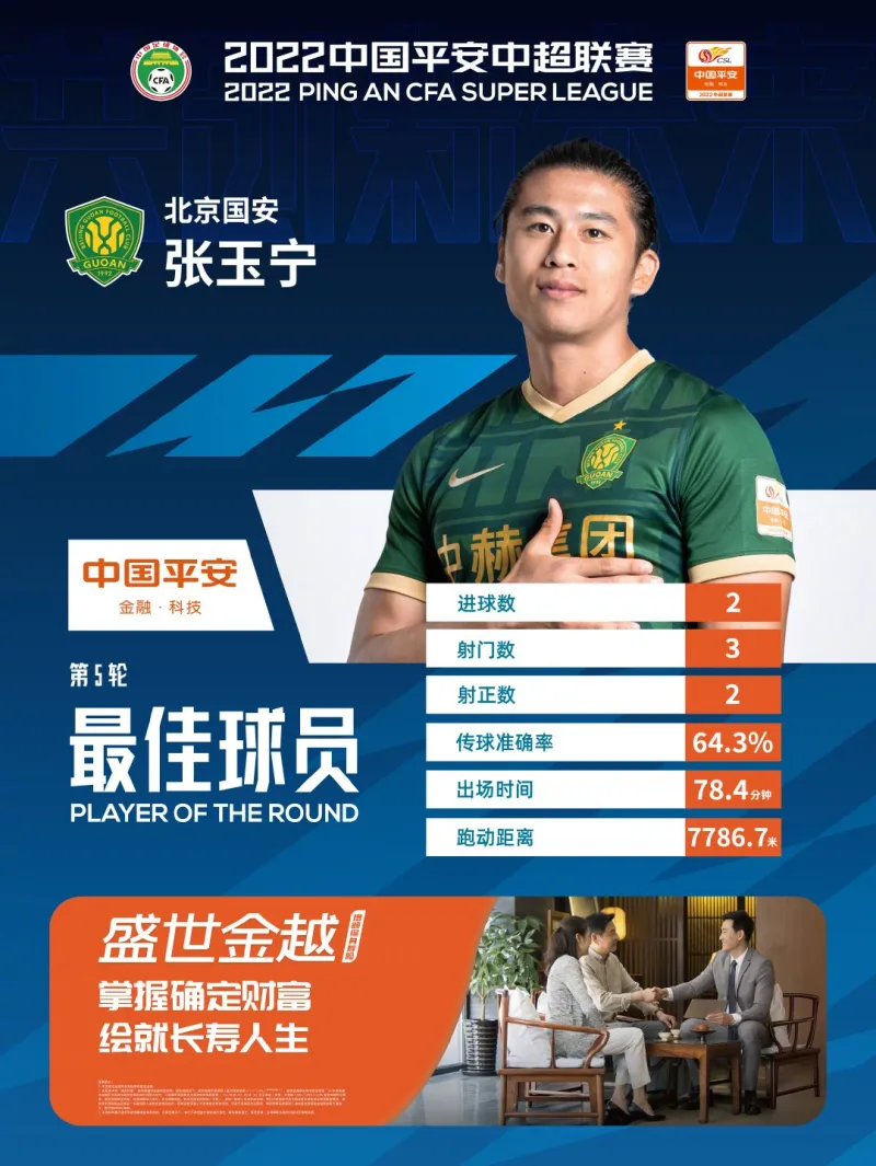 经球迷、媒体投票,北京国安足球俱乐部张玉宁当选2022中国平安中超联赛第5轮最佳球员,在北京国安4-1深圳队的比赛中,张玉宁打进两球,连续两轮上演梅开二度的好戏,为北京国安提供了稳定的火力输出。