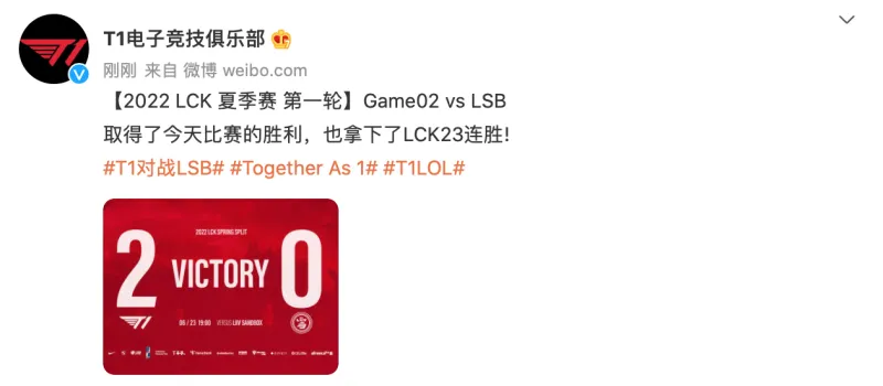 06月23日讯 T1已2比0战胜LSB,成功延续LCK23连胜(2022LCK春季赛常规赛18连胜,季后赛两连胜)。追平2015SKT春季赛-春季赛季后赛-夏季赛的23连胜纪录。