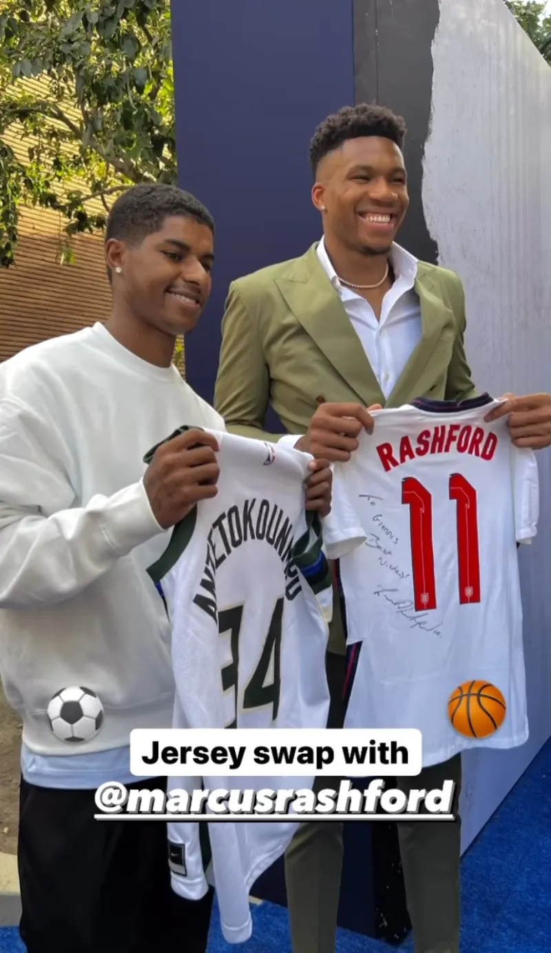 06月23日讯 近日,拉什福德出席了电影《Rise》的首映式,并与电影的主人公字母哥互换了球衣。