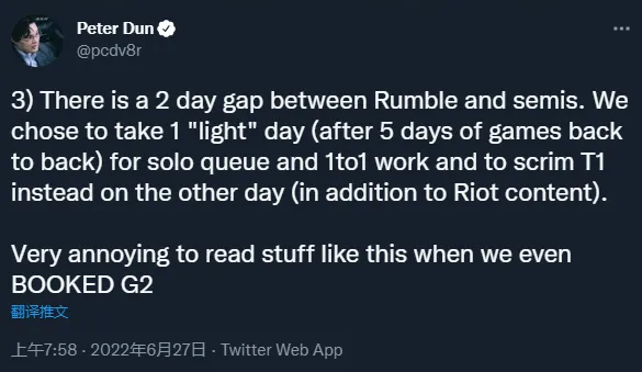 2、我们在对抗赛阶段前取消了和G2的一次训练赛是因为拳头官方最后时刻的内容承诺,G2在同一天也做了这样的事情。