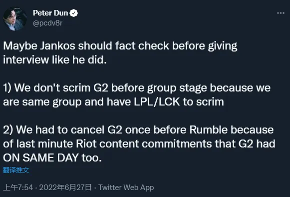 06月27日讯 G2打野Jankos在直播中表示在MSI期间EG拒绝和他们打训练赛。对此EG主教练在个人推特作出了回应。