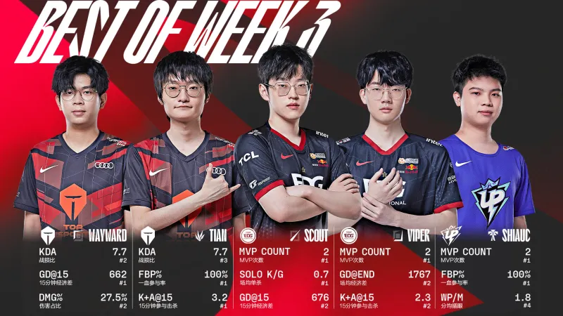 06月27日讯 英雄联盟赛事发布第三周最佳阵容,原文如下: