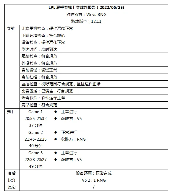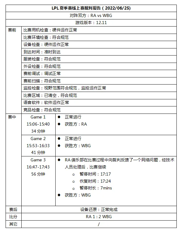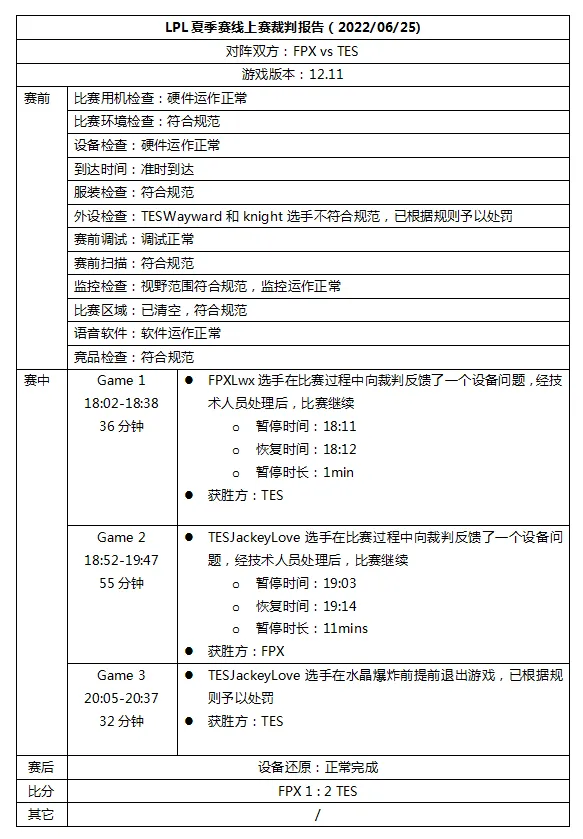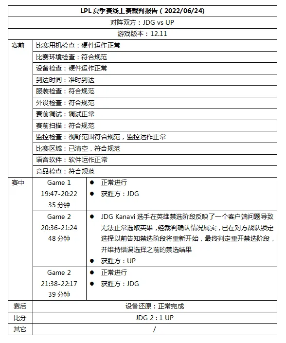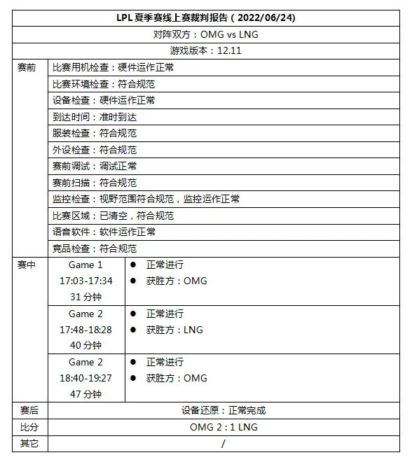06月27日讯 英雄联盟赛事官网发布新公告:LPL夏季赛线上赛裁判报告(2022/06/24-2022/06/25),原公告如下: