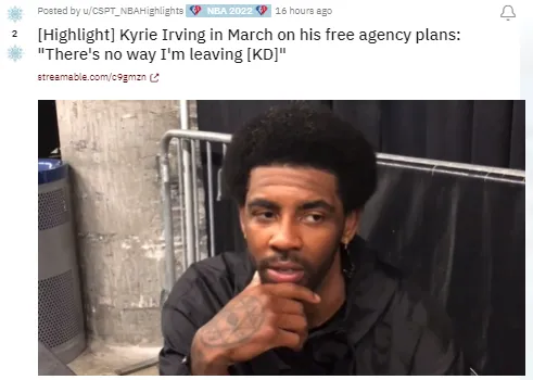 今日美国媒体找出了欧文在三月份接受采访时的一个片段,在采访当中,谈及其夏天成为自由球员后的计划时,欧文曾说:“我不可能弃KD而去(There's no way I'm leaving [KD])。”pH1拜客生活常识网