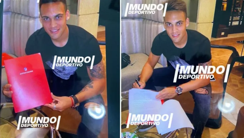 06月28日讯 昨天《世界体育报》独家披露了阿根廷前锋劳塔罗与马竞在2017年时签下合同的照片,照片中当时还在竞技效力的劳塔罗拿着一份红色封皮的马竞合同签字。