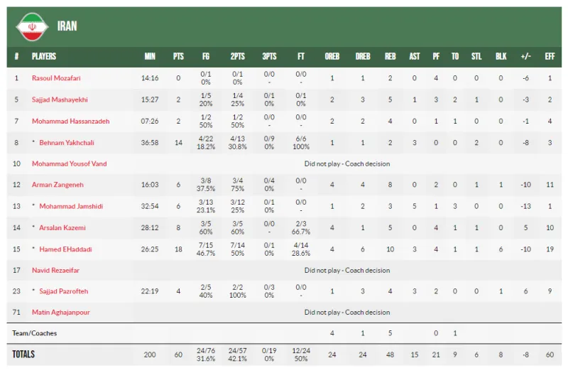 伊朗:哈达迪18分10篮板3助攻1抢断6封盖;雅克查理14分3助攻2抢断;卡兹米8分5篮板,贾姆希迪6分5助攻。