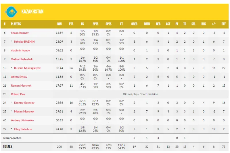 哈萨克斯坦:穆尔扎加利耶夫得到26分7篮板,加夫里洛夫16分4封盖,马尔丘克11分7篮板。