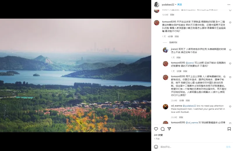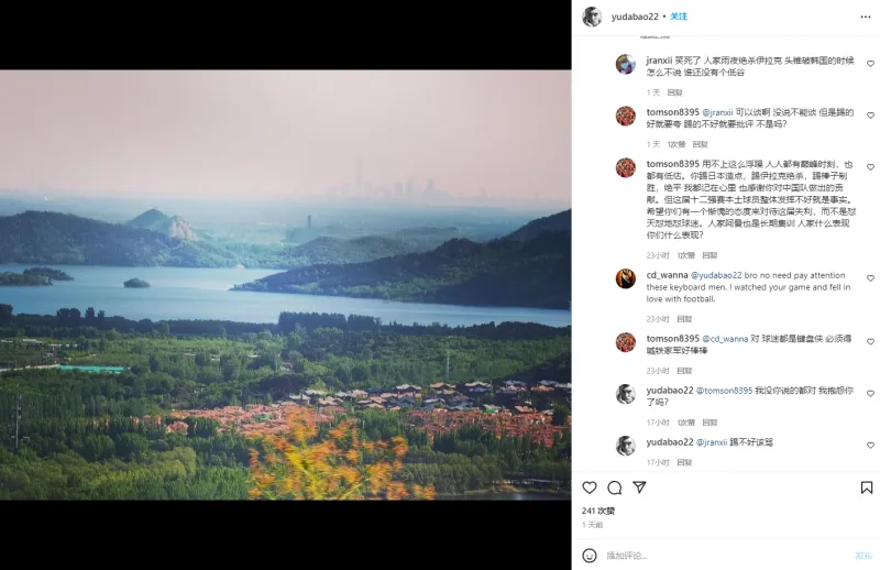 接着也有球迷给于大宝辩护称:“人家雨夜绝杀伊拉克,头槌破韩国的时候怎么不说?谁还没有个低谷?”
