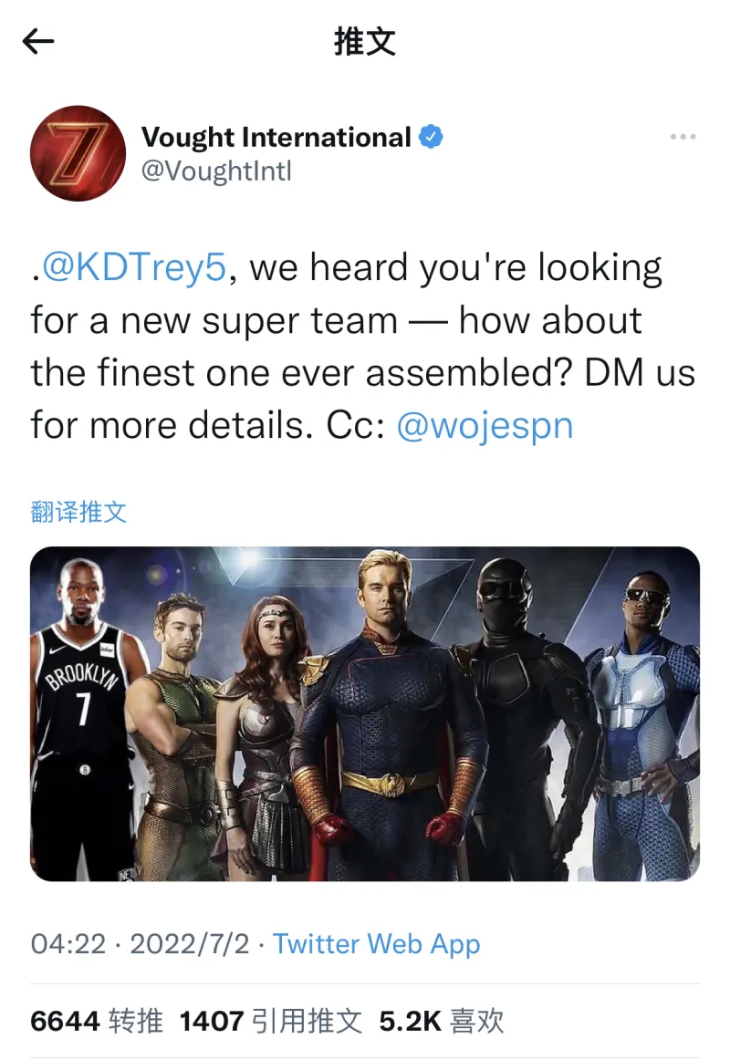 杜兰特申请交易后,目前大火的网剧《黑袍纠察队》官方推特也发推@杜兰特: