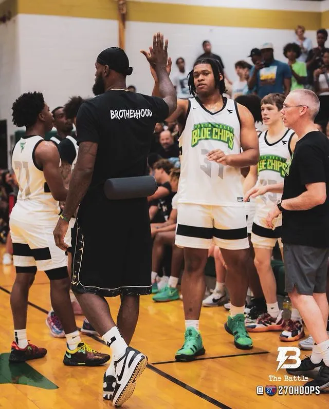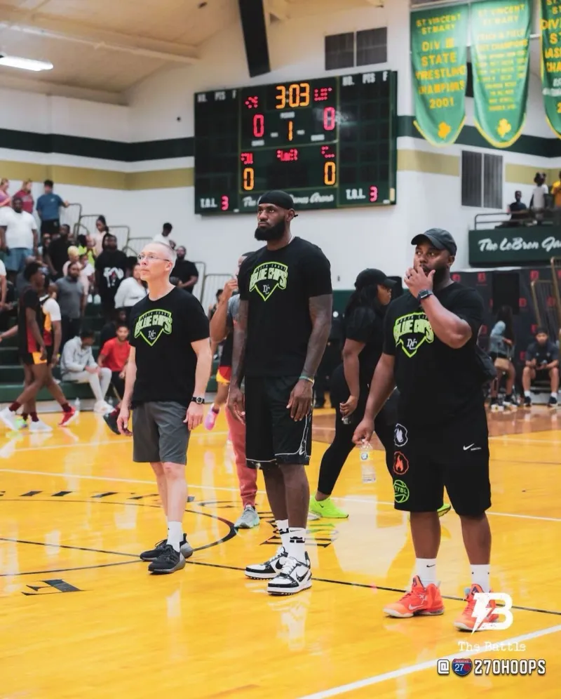 湖人前锋勒布朗-詹姆斯此番带着他的两个儿子回到母校后,除了参赛学生家长外还有一个特殊的身份——他将担任大儿子布朗尼所在的17岁及以下组别Blue Chips队的主教练。另外,詹姆斯的小儿子布莱斯代表16岁及以下组别“追逐伟大”队参赛。