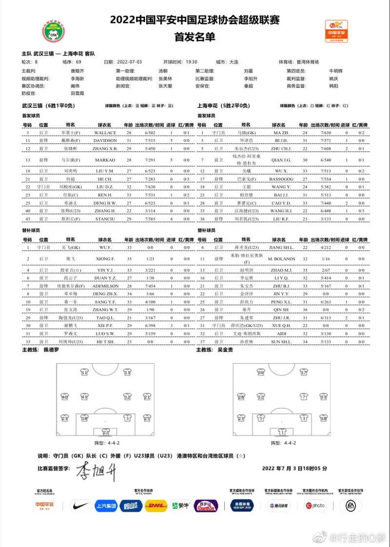 07月03日讯 中超联赛第八轮今日全面打响,榜首两强武汉三镇和上海申花展开直接对话。赛前,双方公布了首发阵容。