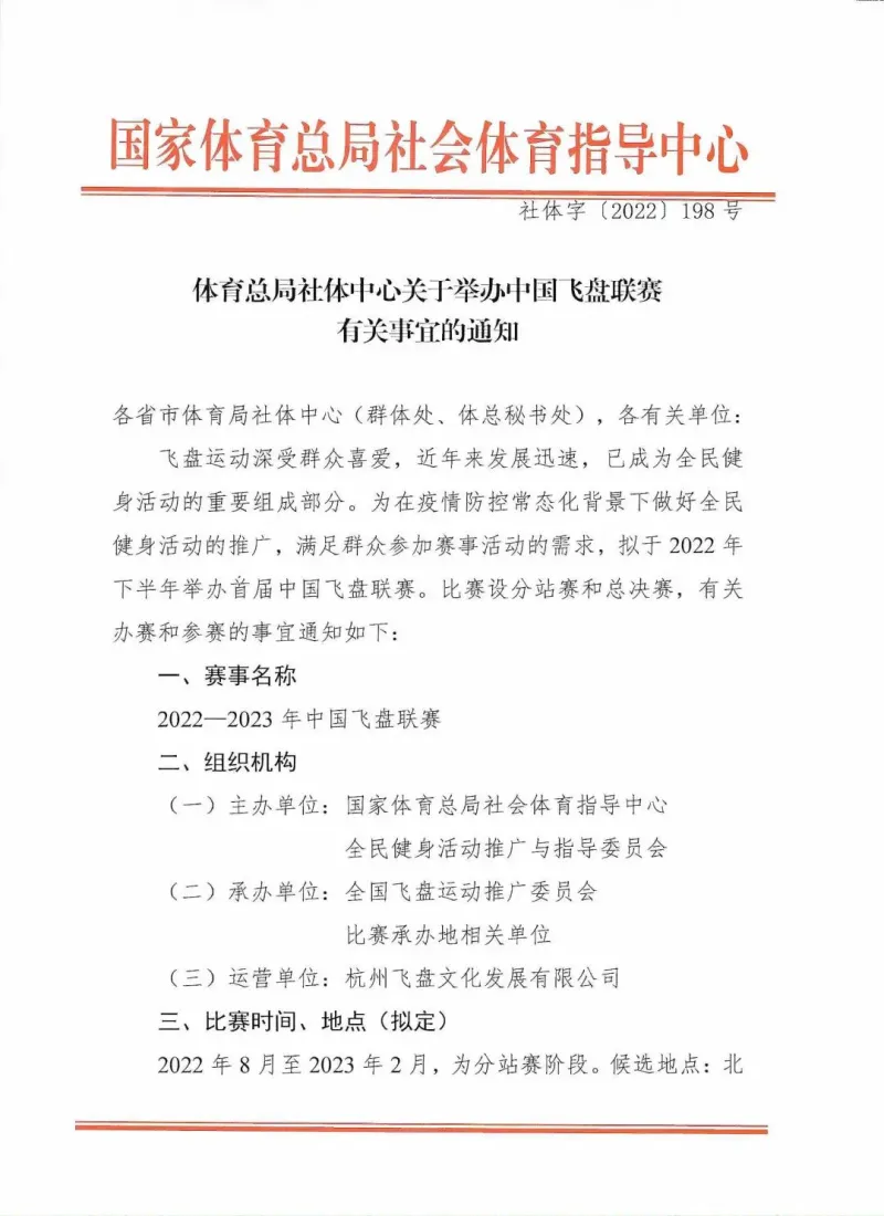 飞盘运动深受群众喜爱,近年来发展迅速,已成为全民健身活动的重要组成部分。为在疫情防控常态化背景下做好全民健身活动的推广,满足群众参加赛事活动的需求,拟于2022年下半年举办首届中国飞盘联赛。赛事名称定位2022——2023年中国飞盘联赛,设分站赛和总决赛。