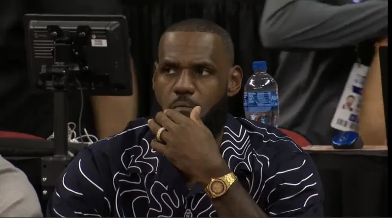 07月09日讯 湖人今日在夏季联赛对阵太阳。在比赛即将开始前,湖人前锋勒布朗-詹姆斯步入球场,坐在底线位置的场边座位上观战。而湖人后卫拉塞尔-威斯布鲁克已经提前来到边线外位置的湖人替补席上观战。