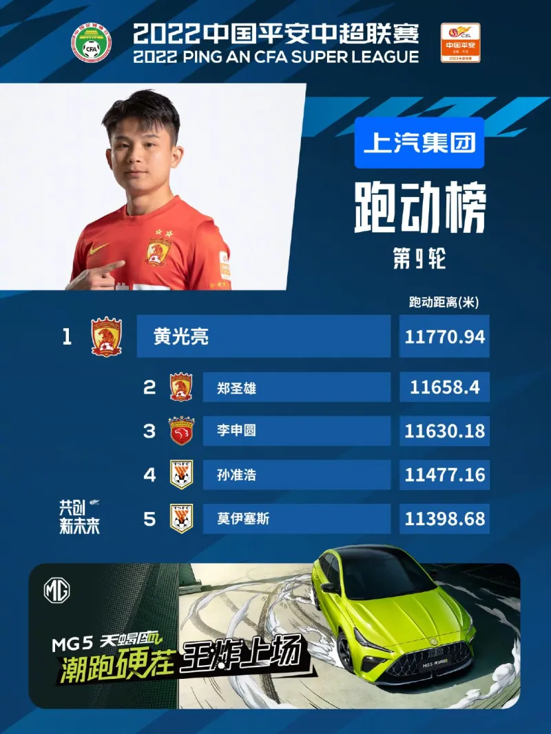 07月10日讯 中超官方公布了第9轮联赛跑动榜单,广州队球员黄光亮连续3轮蝉联第一,他的队友郑圣雄排名第二,山东泰山队的两名外援孙准浩和莫伊塞斯分列第四、第五。