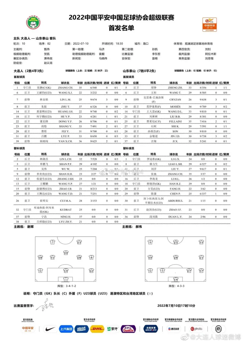07月10日讯 2022赛季中超第10轮大连人对阵山东泰山首发出炉!