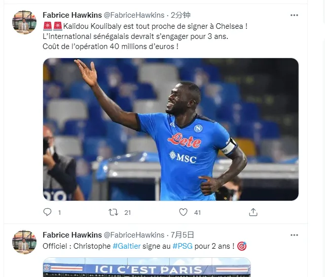 Fabrice表示,意甲球队那不勒斯中卫库利巴利非常接近加盟切尔西!双方预计签下一份3年的合同,这笔转会的总价可能在4000万欧元左右。