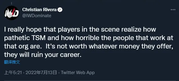 我真的希望选手们能意识到在TSM是多么可悲,以及在那个队伍工作是一件多么恐怖的事。他们给你开出的任何薪水都是不值得的,他们会毁掉你的职业生涯。
