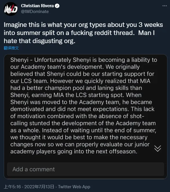 TSM只在reddit论坛发布了这段对选手的评价,在推特和微博并未将这段言论发布出去。而在这段言论发布之后,包括twitch主播IWDominate在内多人对于TSM对于Shenyi的这段恶评发表了看法。