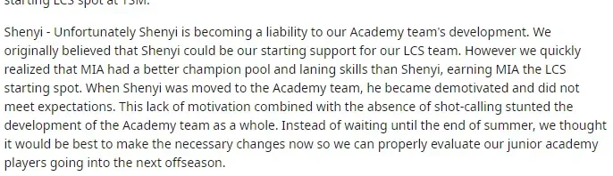 07月13日讯 TSM在今天官宣了Shenyi将离开队伍的消息,并在reddit评价选手时对Shenyi给出了极低的评价。TSM称Shenyi现在已经成为学院队(二队)发展的累赘,在英雄池和对线能力都不如刚刚下放到二队的辅助Mia,并且称Shenyi下放到二队后毫无斗志开始摆烂。
