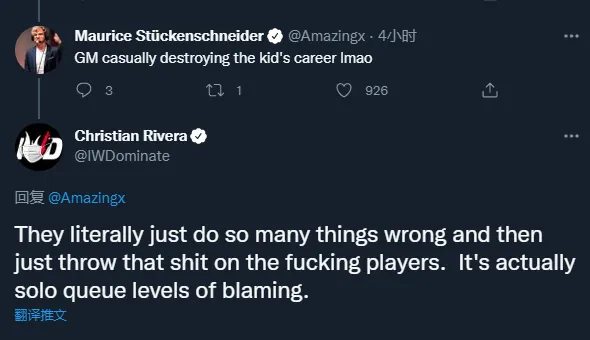 IWDominate:事实上是他们做错了很多事情然后就把责任全推给选手,就算是打单排都不会有这么离谱的责备。