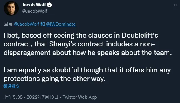 我敢打赌,参考一下之前Doublelift的合同,Shenyi的合同中很可能也包括了不能对战队发表负面评论的条款。但我同样怀疑TSM是否在合同中为Shenyi提供了同样的保护(指不发表负面评论)。
