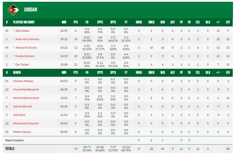约旦:大阿巴斯6分5板、哈瓦斯15分、阿尔达瓦里12分16板4断、伊布拉辛10分6助2断、塔克22分6板、阿尔哈马拉谢7分5板。