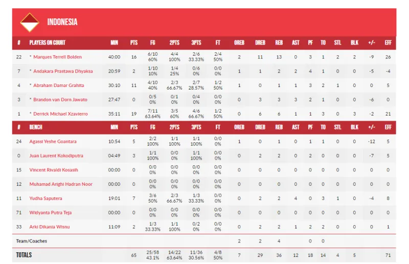印度尼西亚:博尔登16分13板2帽、格拉希塔11分、克扎维耶罗19分、萨普拉特7分4助。