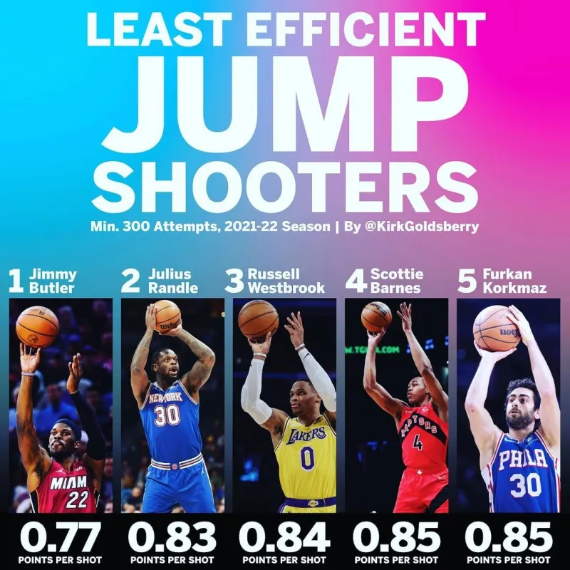 在2021-22赛季常规赛出手至少300次跳投的球员中,最低效的5位跳投手如下(依据平均每次出手得分):