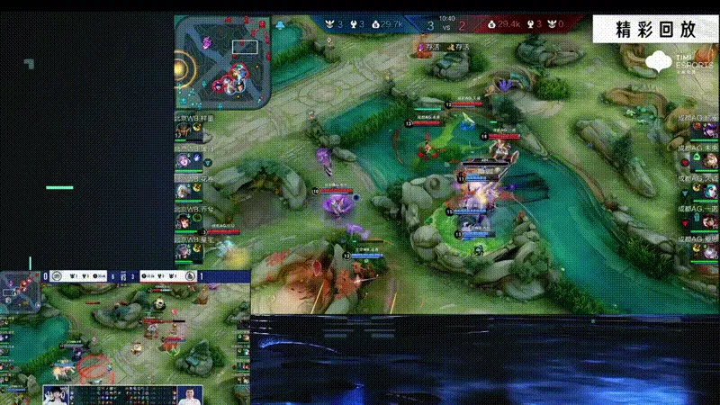 10分40秒,龙王处爆发团战,姜子牙大闪收掉阿古朵本体,马超未能收掉残血蒙恬,WB打出一波1换3